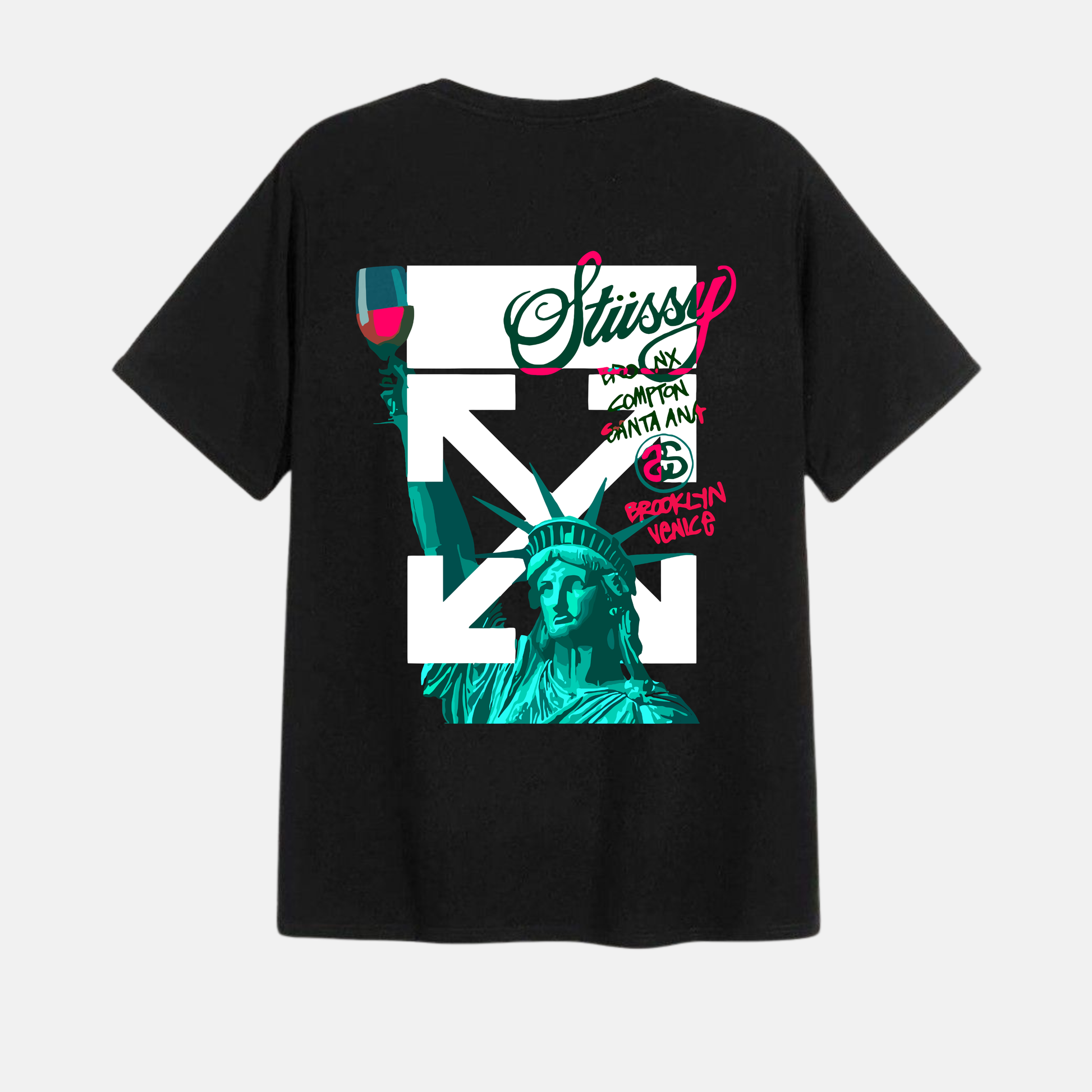 Incluye un estampado trasero de gran formato con composición de flechas cruzadas y arte clásico en tonos verde turquesa con detalles vibrantes que contrastan sobre la base negra. En la parte frontal presenta el diseño en versión reducida al lado izquierdo del pecho, logrando un equilibrio visual moderno y atractivo.